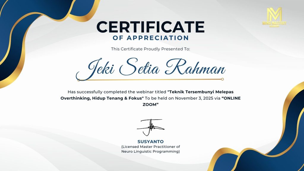 “Program 90 hari berbasis Mindfulness & Neuro Linguistic Programming (NLP) untuk keluar dari pola lama, menanam mindset baru, dan melihat perubahan nyata. Batin lebih tenang, energi lebih segar, dan hidup lebih terarah.”